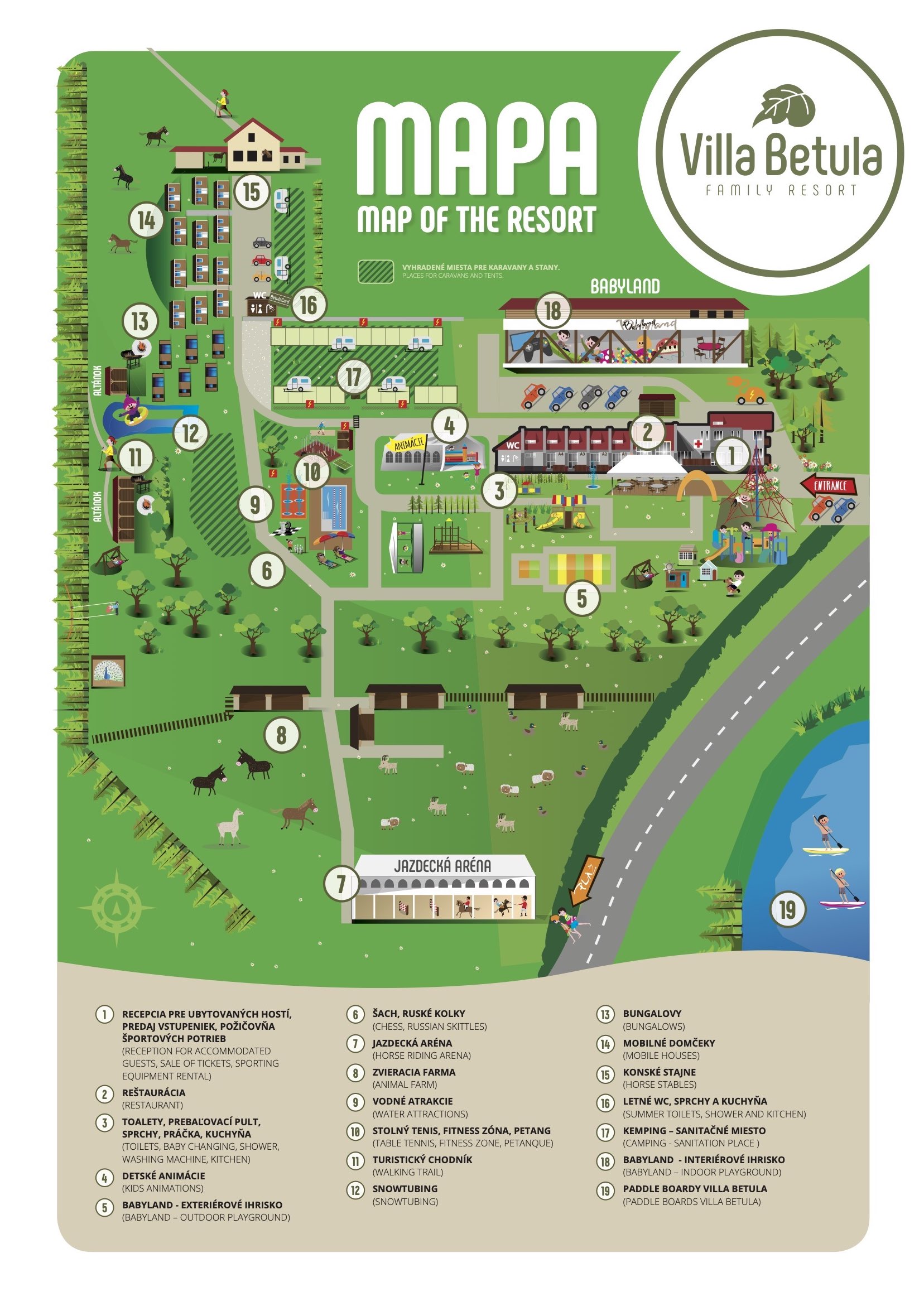 Mapa areálu Villa Betula Resort s piktogramami a obrázkami